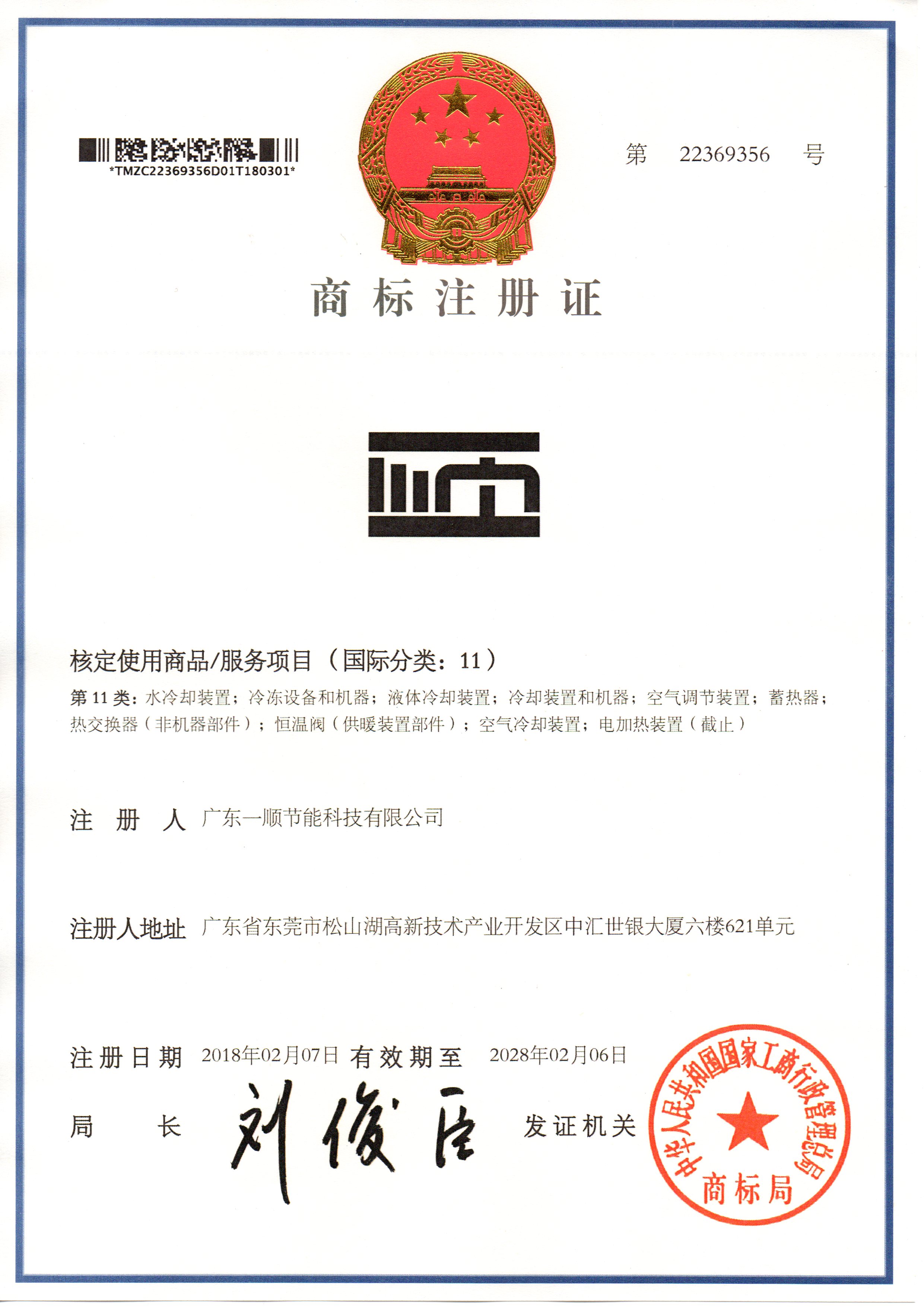 一顺科技 商标注册证